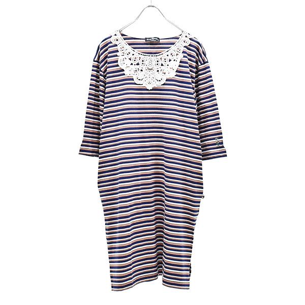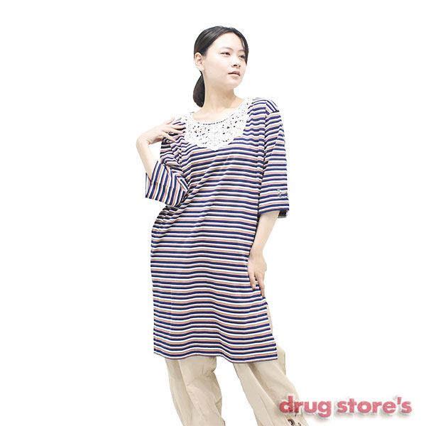 drug store's 20/-天竺 マルチボーダー柄 衿レースたたきつけ チュニック