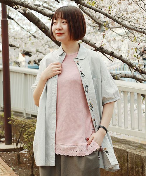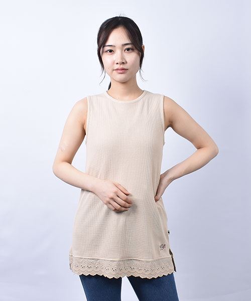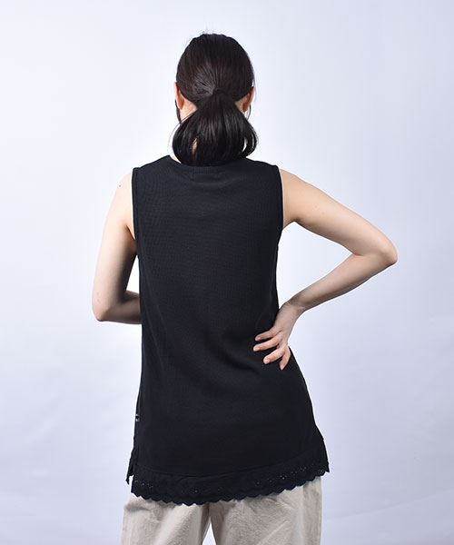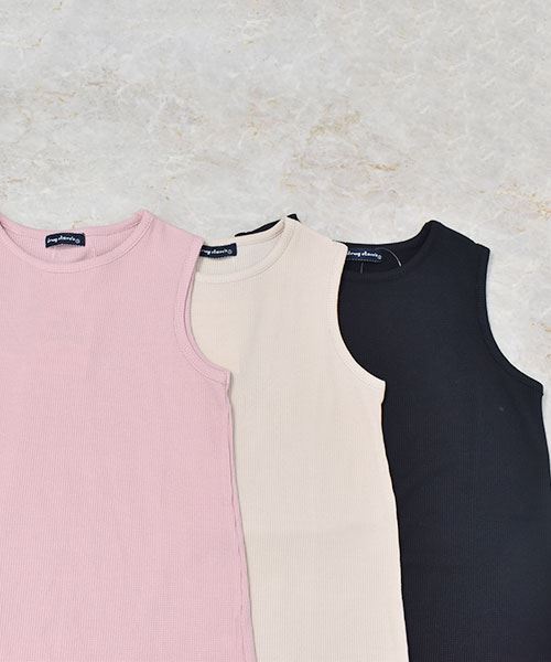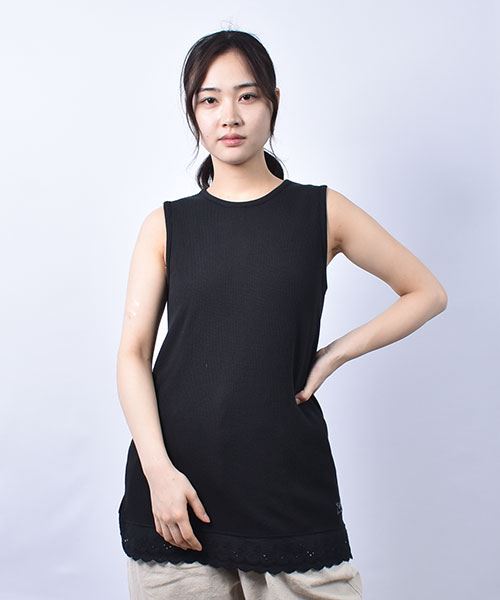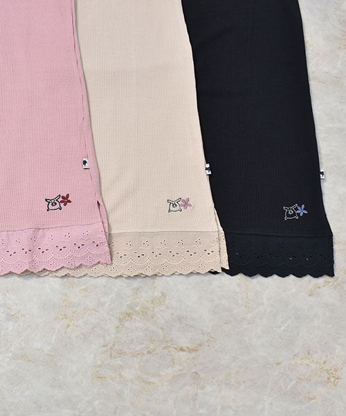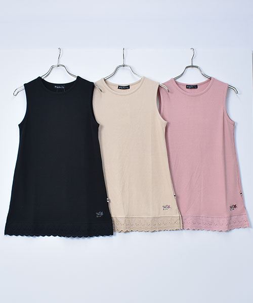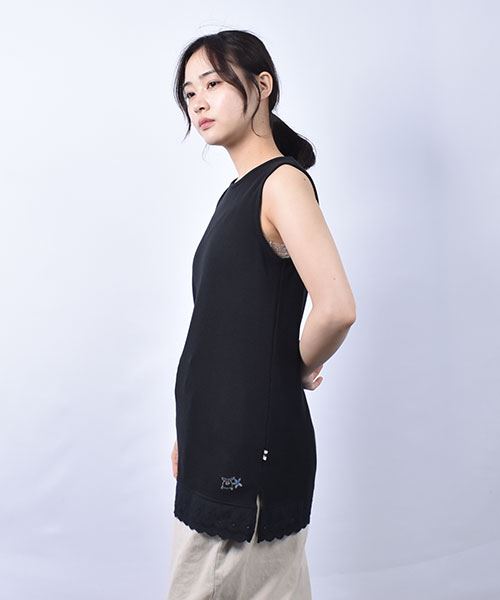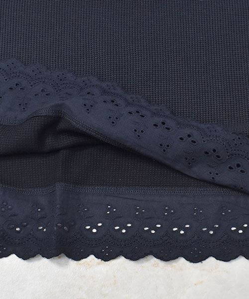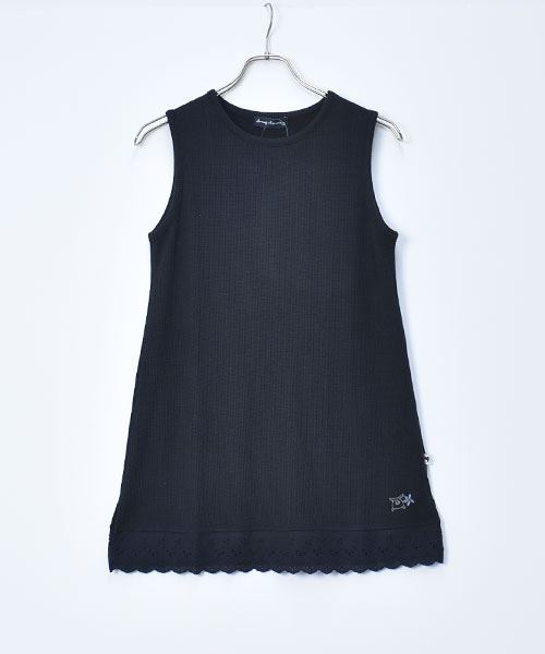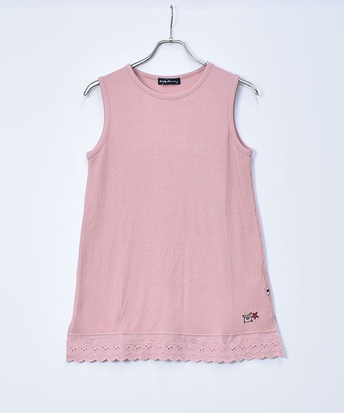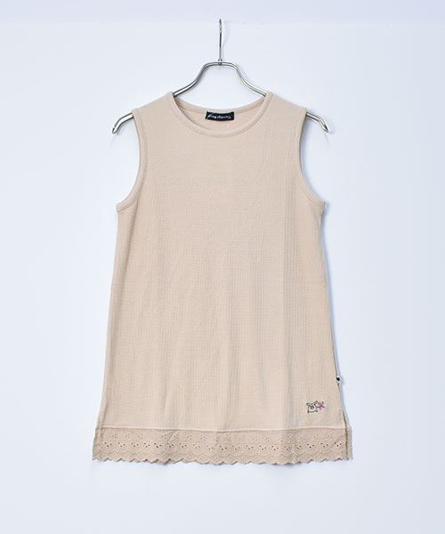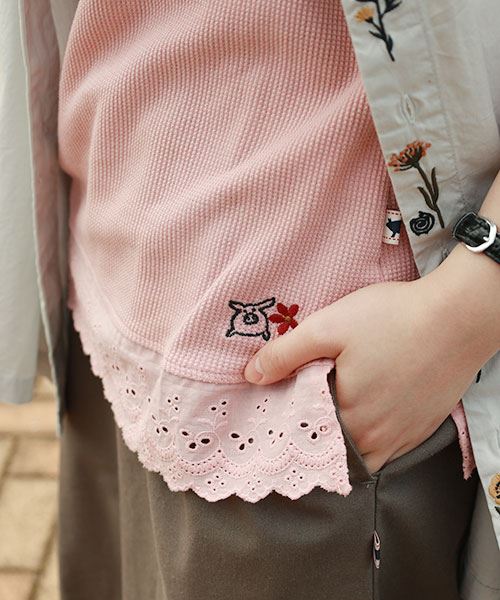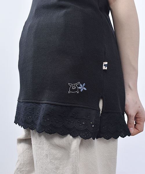 drug store's ワッフル 裾レース切替 ブタ刺繍 タンクトップ